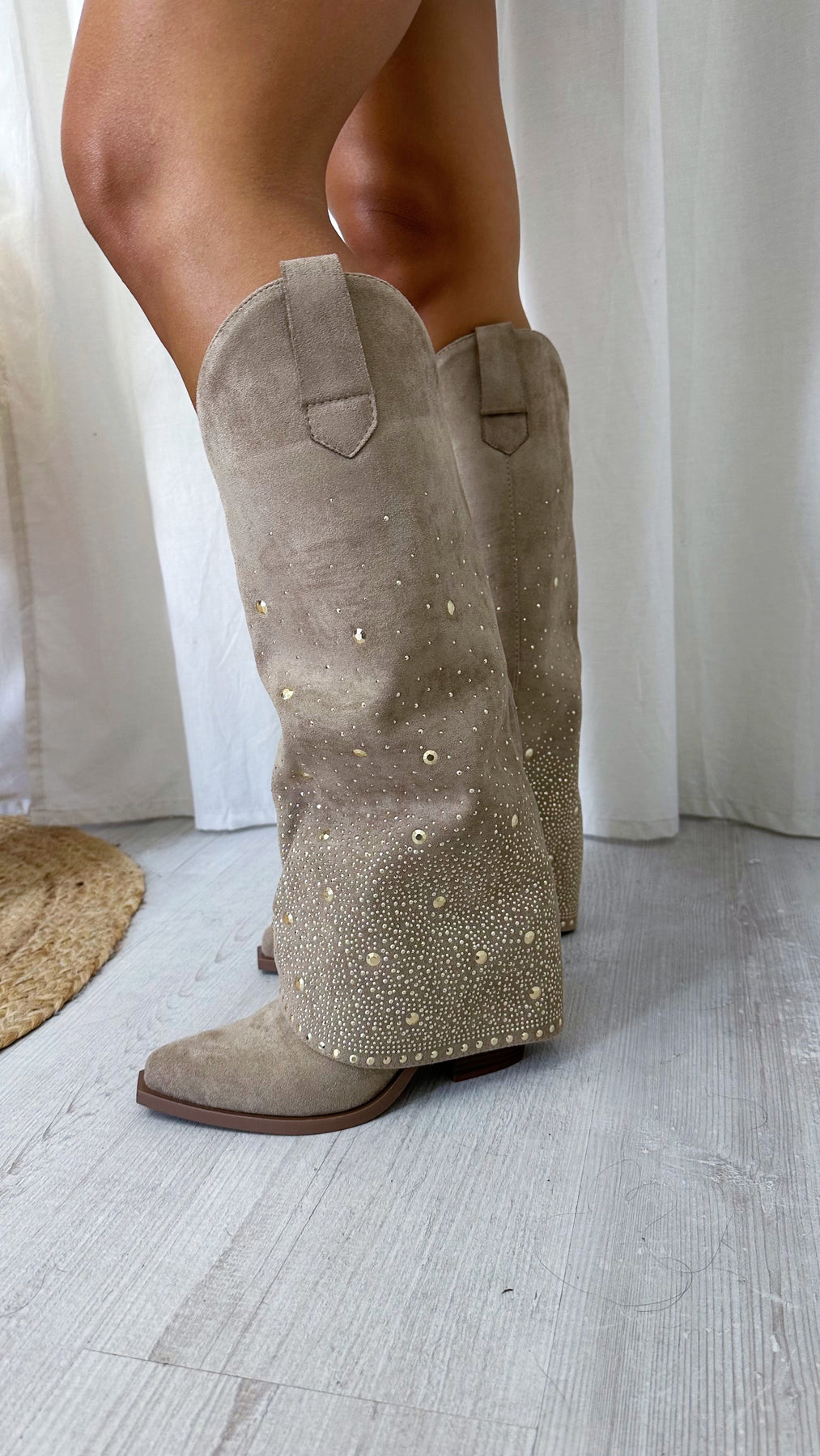 Gold Stud Knee High Fold Over Cowboy Boots - MOCHA