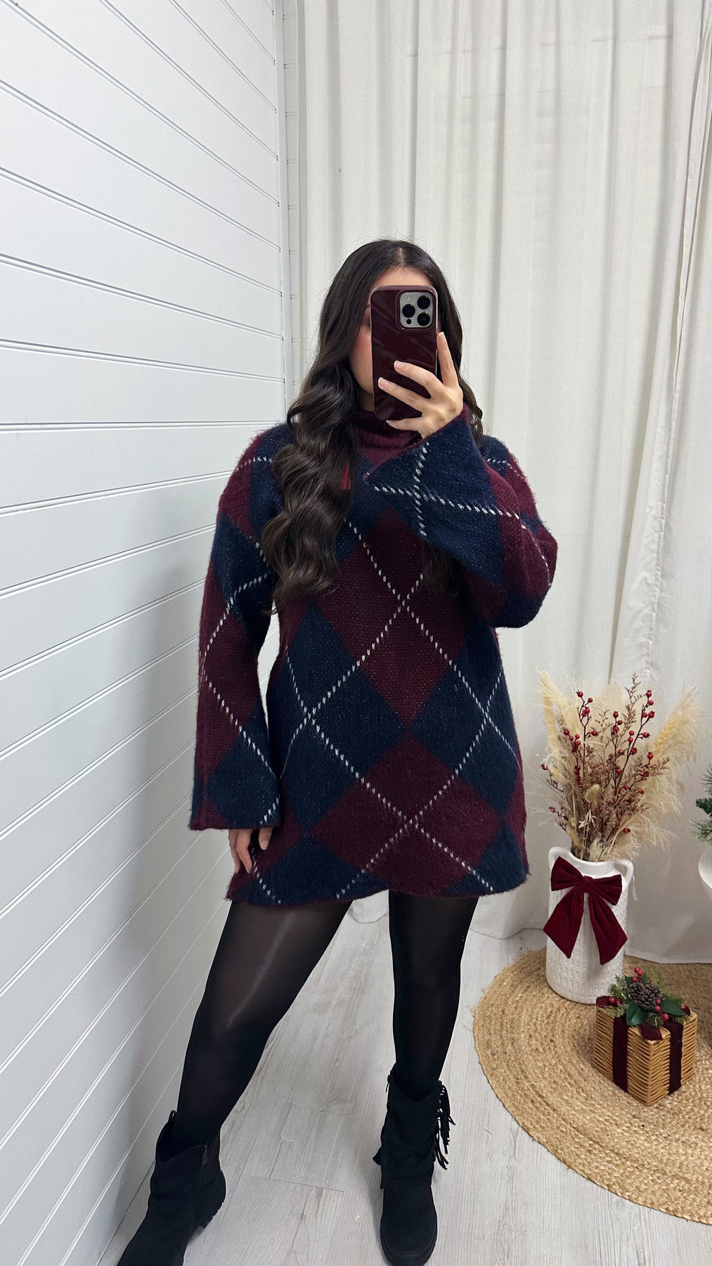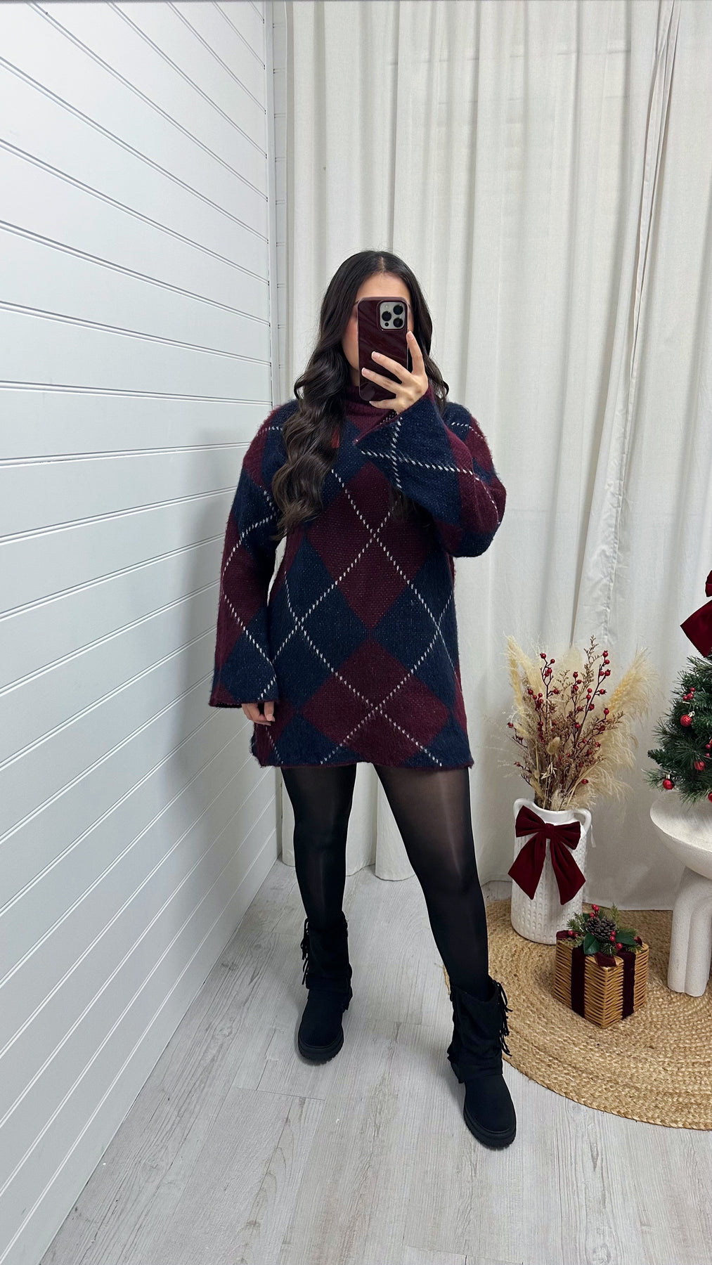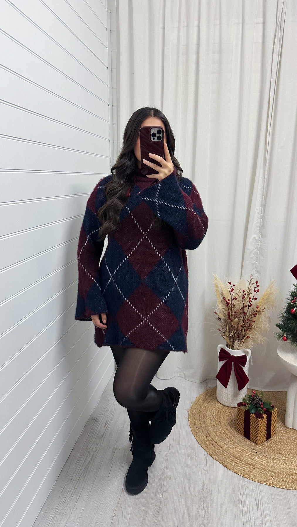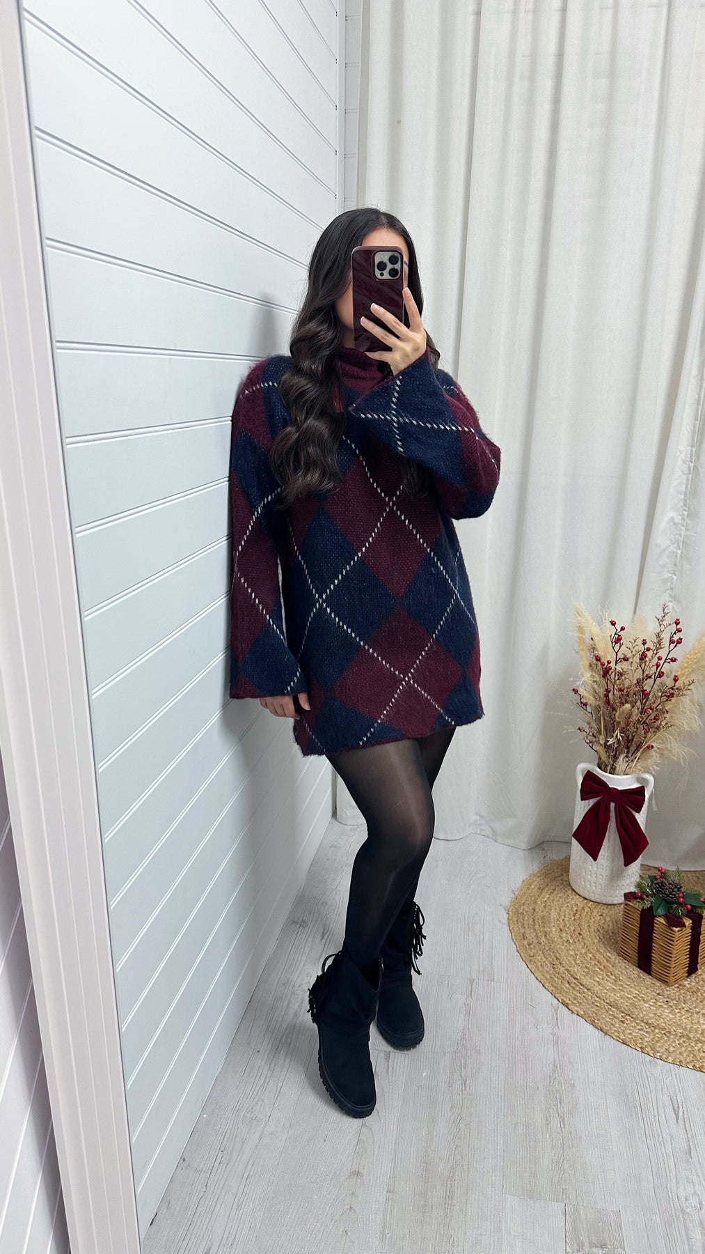 Argyle Woollen Jumper Dress - NAVY/WINE