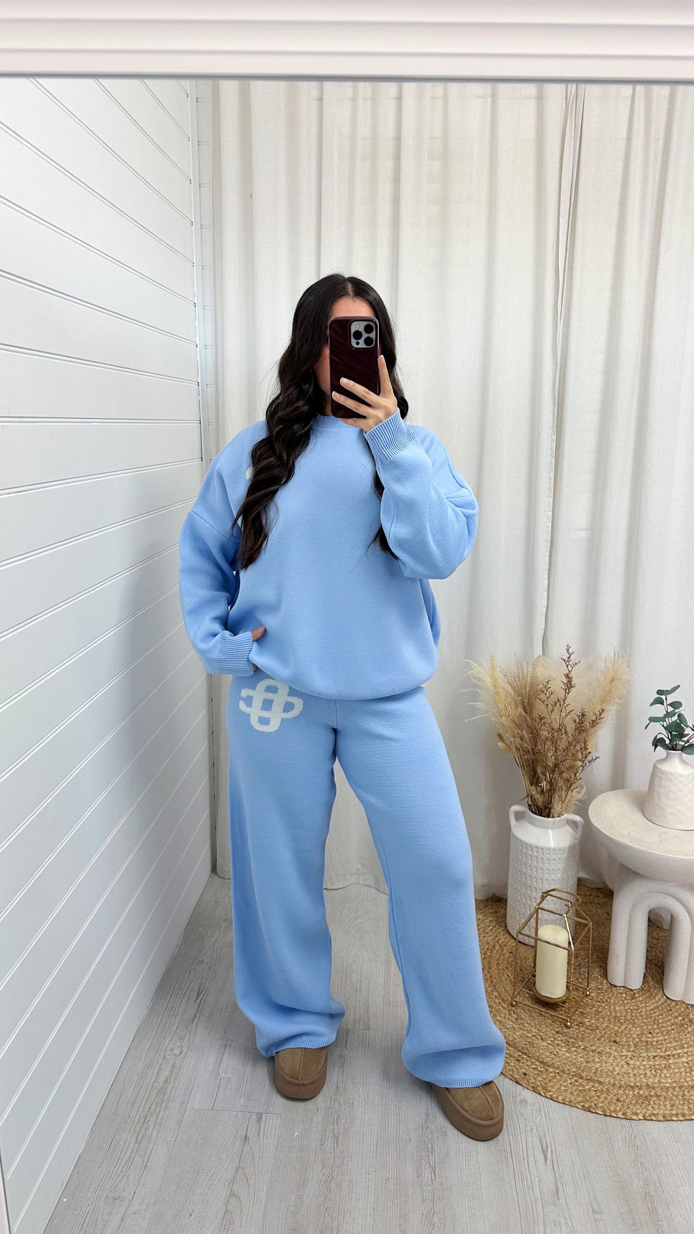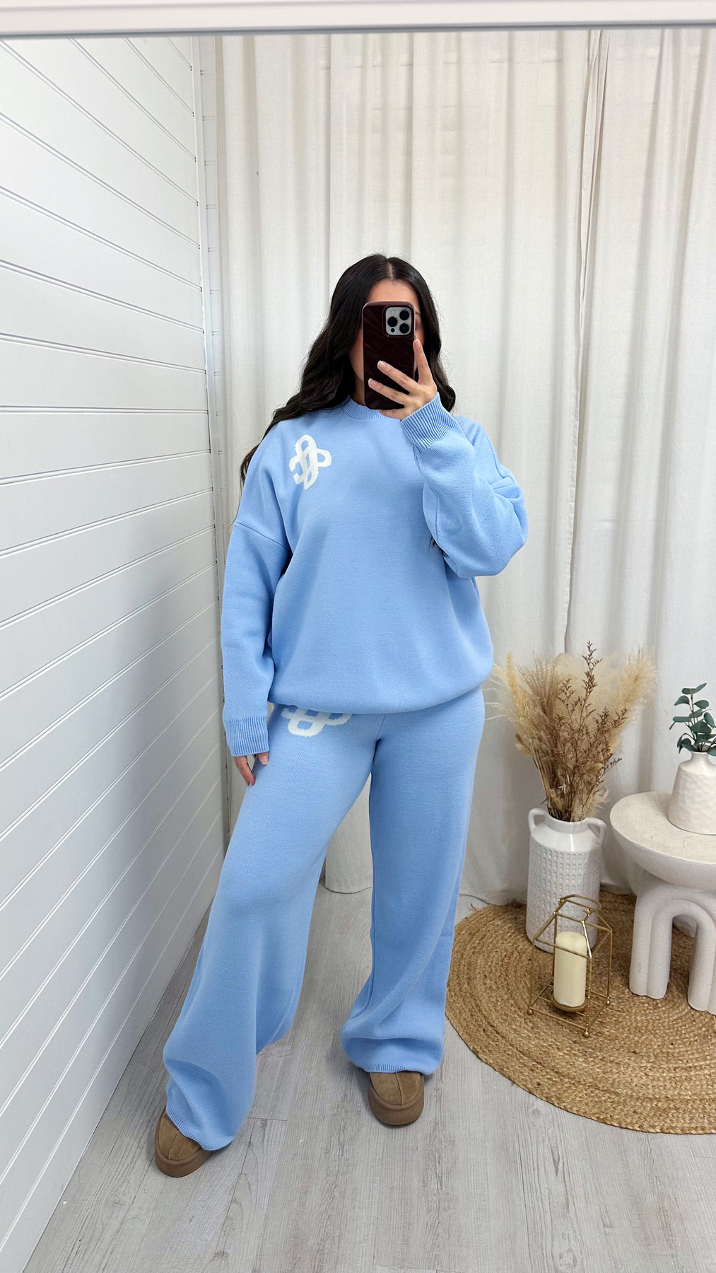Knitted Logo Sweatshirt and Wide Leg Trousers Co-Ord - BABY BLUE