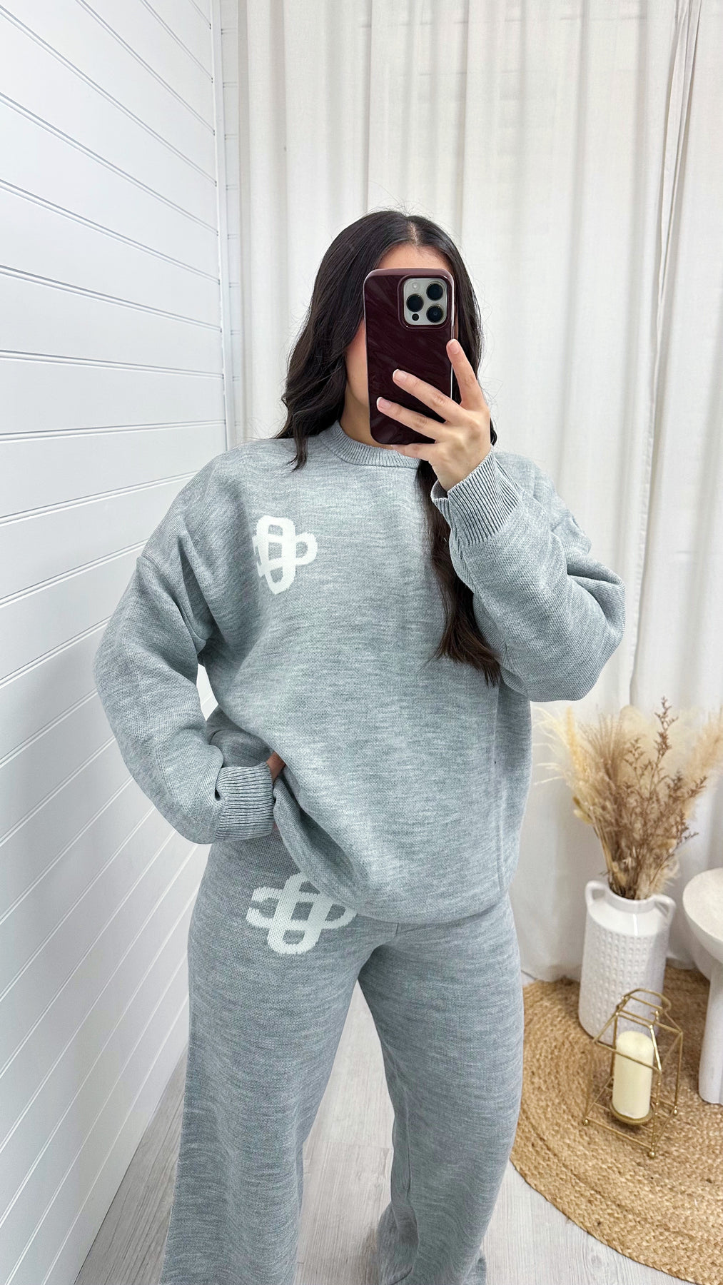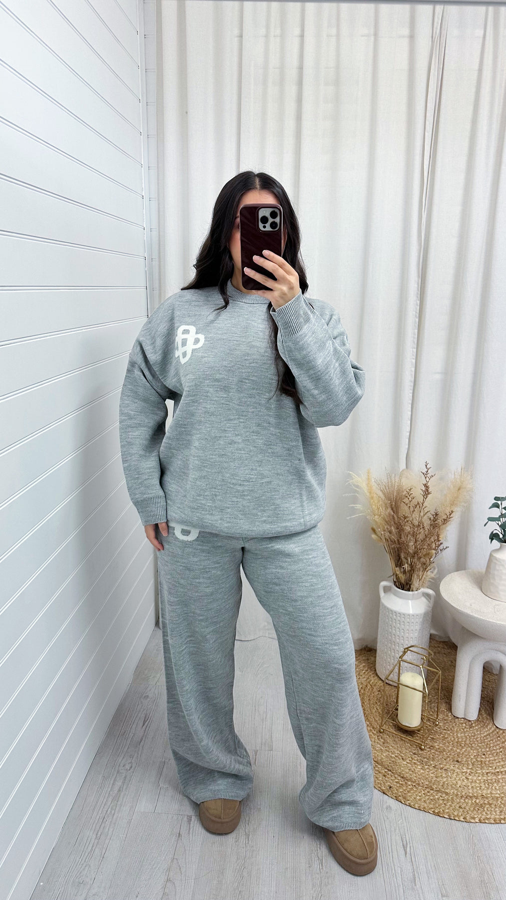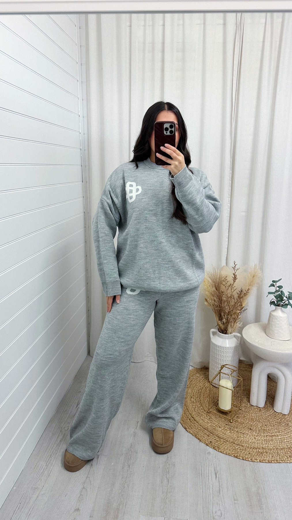Knitted Logo Sweatshirt and Wide Leg Trousers Co-Ord - GREY