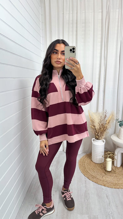 Stripey Block Colour Half Zip Sweatshirt - BURGUNDY