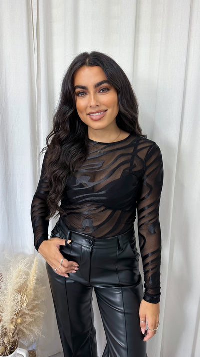 Satin Swirl Mesh Long Sleeve Top - BLACK