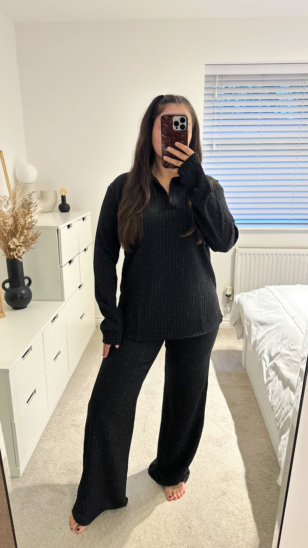 Textured Shimmer V Neck Top and Trousers Co-Ord - BLACK